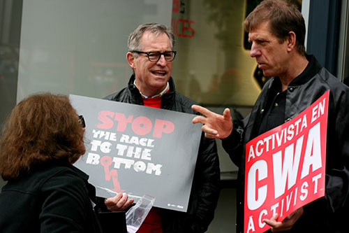 Carl Hall (right) and a fellow CWA member demonstrator held signs outside the Verizon store on Market street in San Francisco on Friday. Photo by Andy Sweet
