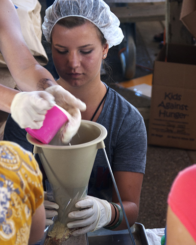 Hundreds of volunteers, young and old, donned hair nets and gloves June 27 in an effort to reach an ambitious goal of preparing 100,000 emergency food aid packages in ten hours for national and global distribution and consumption.