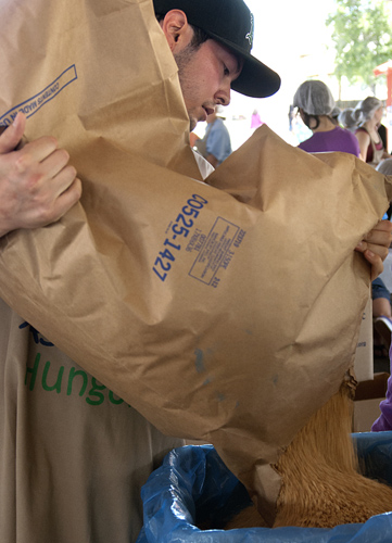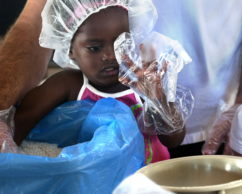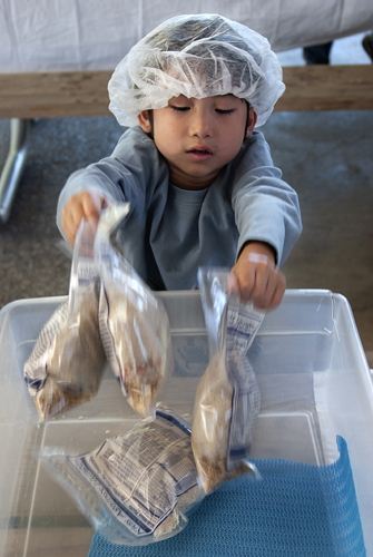 Amryn Vancleave, 2, was the youngest volunteer to attend a Kids Against Hunger event held on June 27, 2012 at the Alameda County Fairgrounds in Pleasanton, Calif. The organization came together with the public to pack 100,000 bags of food in 10 hours to store at the Fairgrounds for emergencies. They went beyond their goal and will be adding the extra bags to the boxes being shipped to Haiti by the end of next week. Photos by Jessica Worthington.
