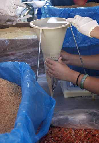 As many as 1500 volunteers throughout the shift were able to prepare as many as 12,000 emergency bags each hour. Each bag, which can feed up to six people, contains a nutritious non-perishable soy-rice and vegetables casserole fortified with vitamins and minerals. A one-cup serving contains as much protein as a three-ounce steak and provides nutritional sustenance for one person each day.