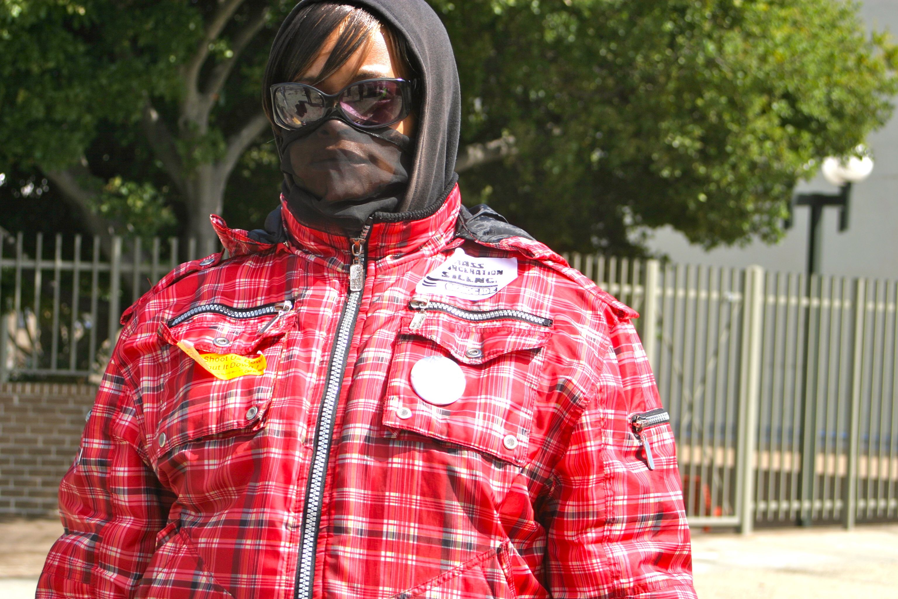 Denika Chatman mother of Kenneth Harding dons a black veil in mourning for her son as she stands with family and friends in Mendell Plaza. Photo by Maggie Ortins